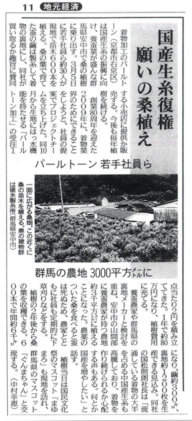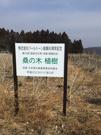 2012年3月3日、パールトーン社員の他に趣旨に賛同された全国の呉服小売店、24社から約30名の方と共同で10アールの土地に計600本の桑の木を植樹いたしました。