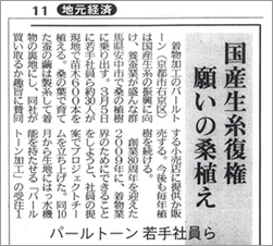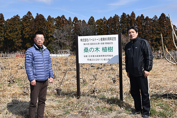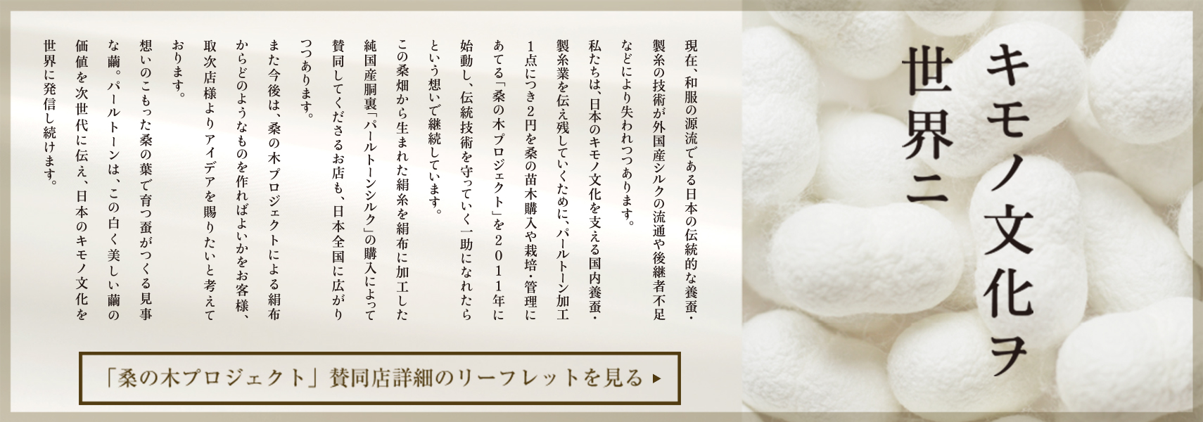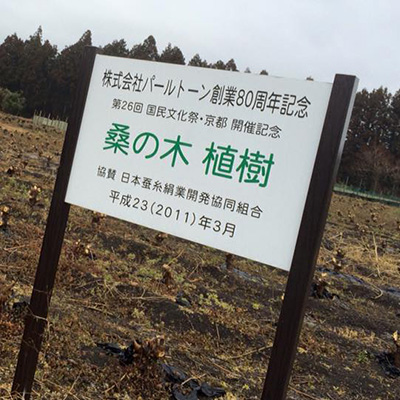 パールトーンでは、日本の伝統文化を支える国内養蚕・製糸業をまもるため、パールトーン加工1点につき2円を桑の苗木購入や栽培・管理にあてる「桑の木プロジェクト」を続けています。