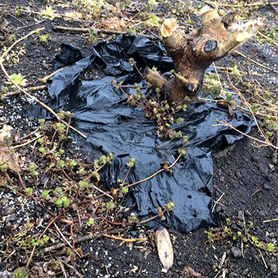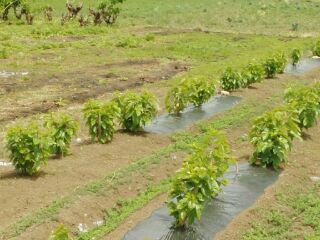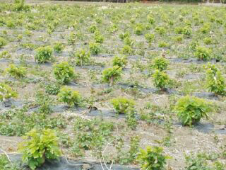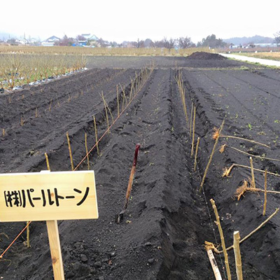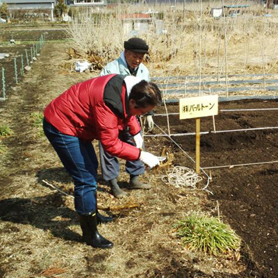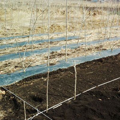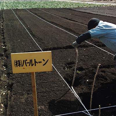 2人1組で等間隔に植え、全体に土をかぶせていきます。その後長さを10センチ〜15センチほど切りそろえ、仕上げに一畝ごとにシートをかけて作業完了です。
