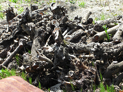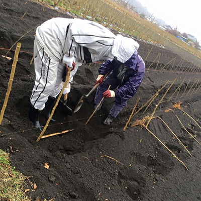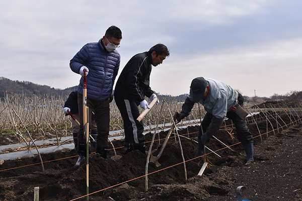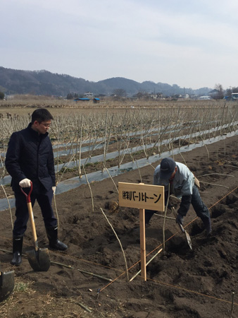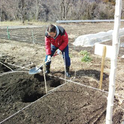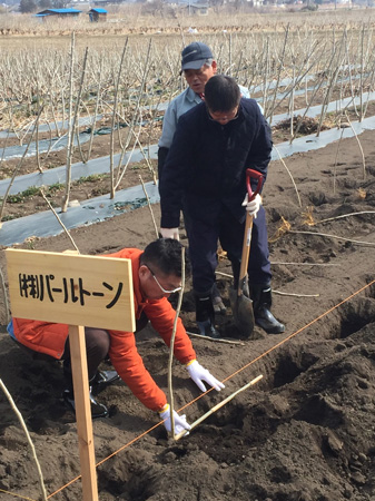 3年連続の晴天の中での作業となりました。農地をご提供いただいている高木様に指導していただき、この年は根ごしらえ(苗木の根を整える作業)から挑戦。