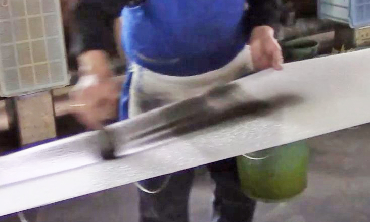 ⑧ 刷毛刷り:水洗した後、再度張り木・伸子で引っ張り乾燥させます。硬刷毛により生地の表面の表裏を十分刷毛摺りし、染料や不純物を取り除くと同時に、生地に光沢を与える。