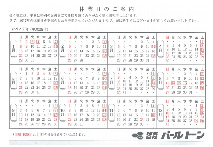 ※2017年休業日のご案内につきましては添付資料をご確認ください。